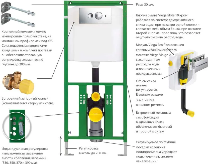 - Viega Eco Plus 8141.2. Модель с узкой рамой для угловой установки с приличным запасом регулировки по высоте. Смыв воды механический, есть три режима: полный, эконом и старт/стоп. Минус – окошко для обслуживания небольшое.