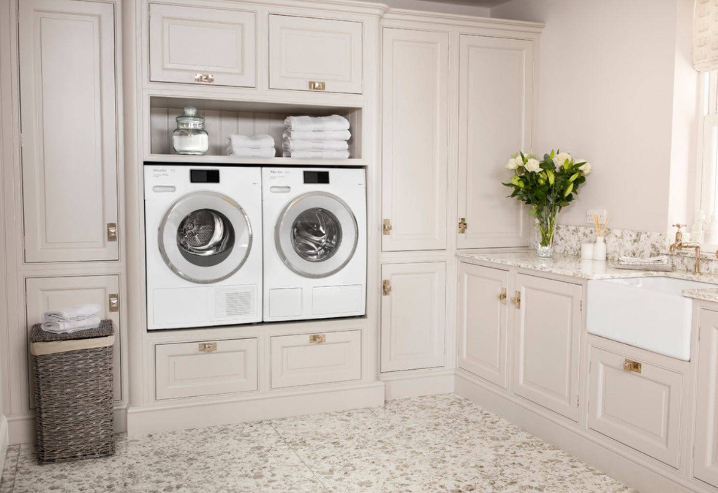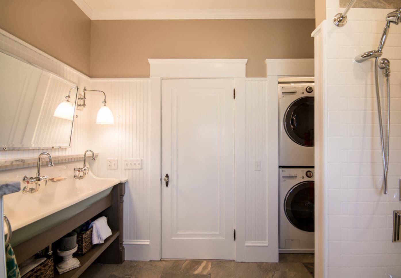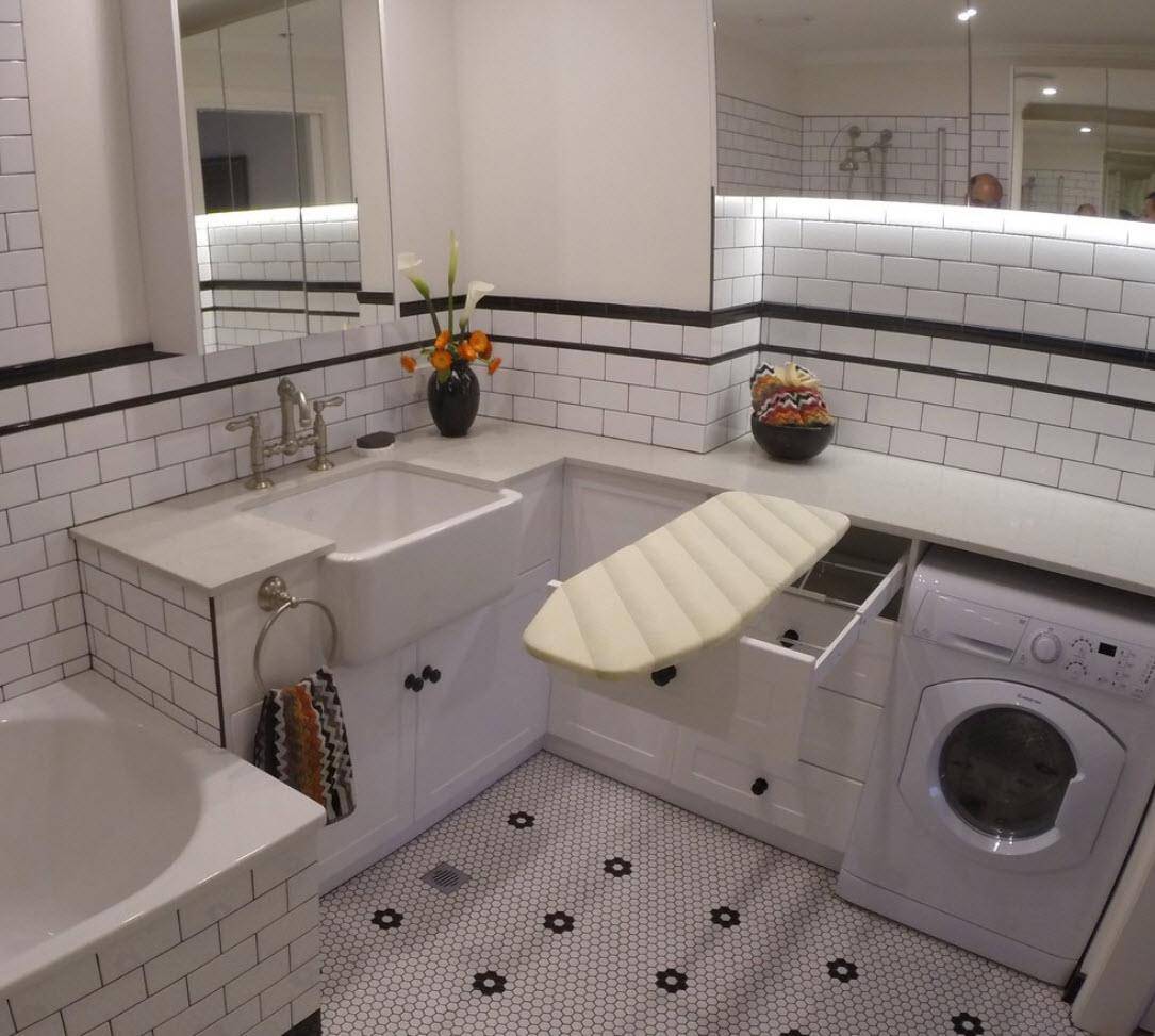 Если у нас есть ниша в ванной, то выделите ее полностью в уголок для прачечной. В дополнение к технике вы сможете там разместить все принадлежности, необходимые для стирки. Ниши легко создать и скрыть. Таким образом, вы сконструируете мини-пространство для прачечной.