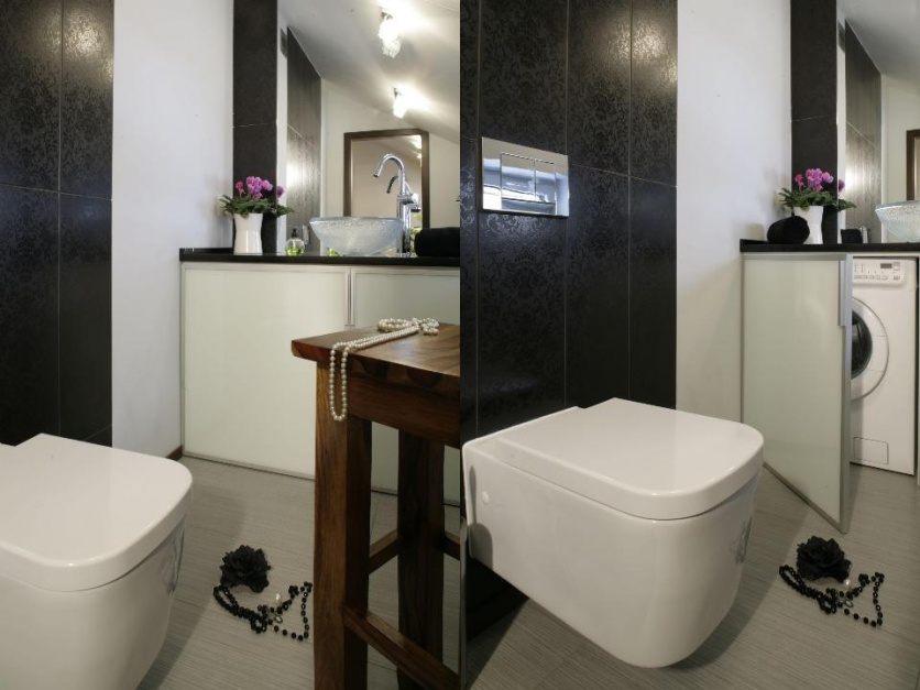 Для ванных квартир современных планировок можно пренебречь перечисленными правилами. Это касается и установки стиралки. Данные помещения настолько просторные, что можно изготовить специальную нишу под постановку бытовой техники.