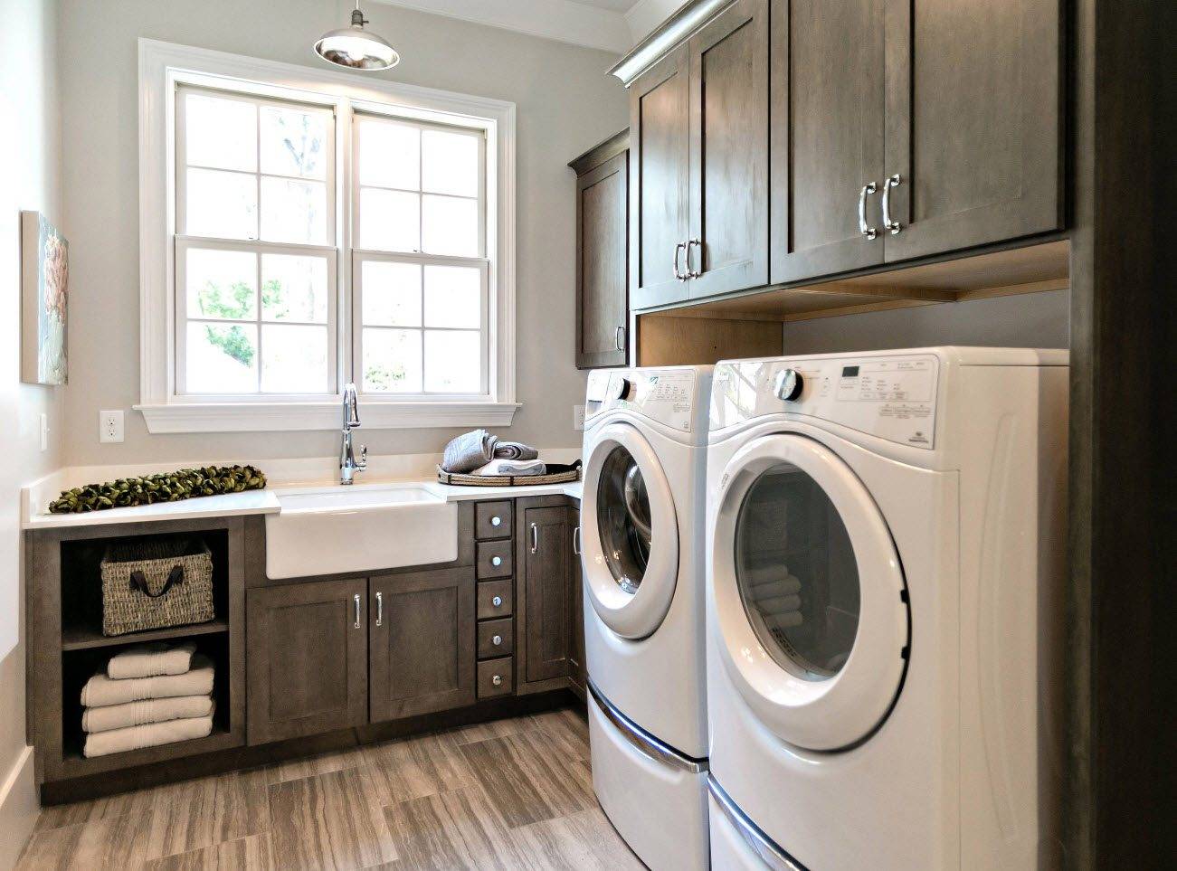 Если есть достаточно места в задней части комнаты, то можно даже сконструировать специальный шкафчик для прачечной, куда постаивть стиральную машину. Если техника не используется, то остается невидимой за закрытой дверью.