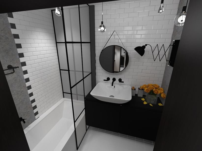 Простой минималистичный дизайн, белая ванная с чёрными шкафами