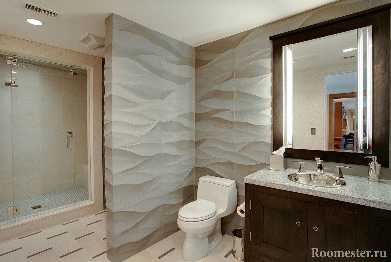 Чаще всего объемной делают стену над ванной или полностью свободную стенку. Необычная отделка поможет выделить зону унитаза и не сделает на ней сильный акцент, если будет более светлых оттенков.