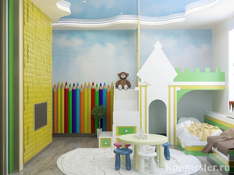 Интересным дополнением для детской будет часть стены с волнообразной фактурой, которую окрашивают в радужные цвета. В детской этот декор рекомендуется применять только у игровой зоны.