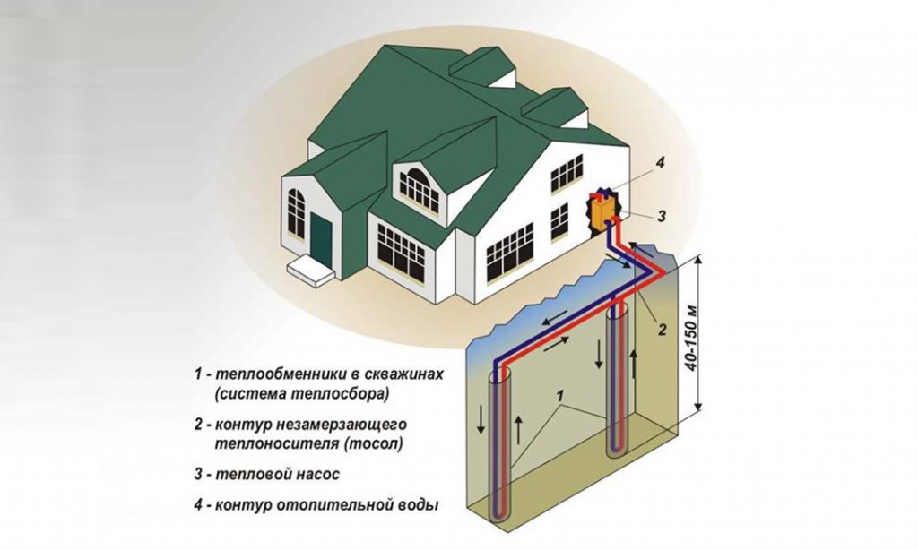 В данной схеме трубы погружаются в землю на глубину, где на протяжении всего года температура удерживается на уровне 7-10 градусов. Коллекторы могут располагаться вертикально и горизонтально. В 1-ом случае предстоит бурить несколько очень глубоких скважин, во втором – укладывать змеевик на определенной глубине.