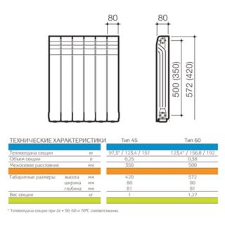 Очень маленькая толщина стенки секций и овальное сечение, обладающее специфической геометрией, гарантируют огромное рабочее давление в 20 бар и высокую теплоотдачу в 2448 Вт, что обеспечивается большим количеством секций, общим весом в 19 с половиной килограмм. Объем всех секций составляет три литра, а расстояние между осями около 8 сантиметров.
