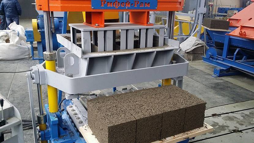 - Выдержка под гнетом или прессом. Поперечная статическая нагрузка позволяет уплотнить блок, но не обеспечивает равномерной прочности по всему срезу. При слишком раннем снятии гнета возможен частичный возврат формы, поэтому блоки оставляют под прессом в течение суток.