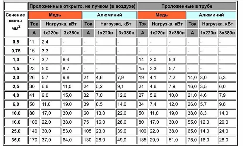 Разглядим, какую нагрузку способен выдержать медный кабель различного сечения в сети 220 Вольт: