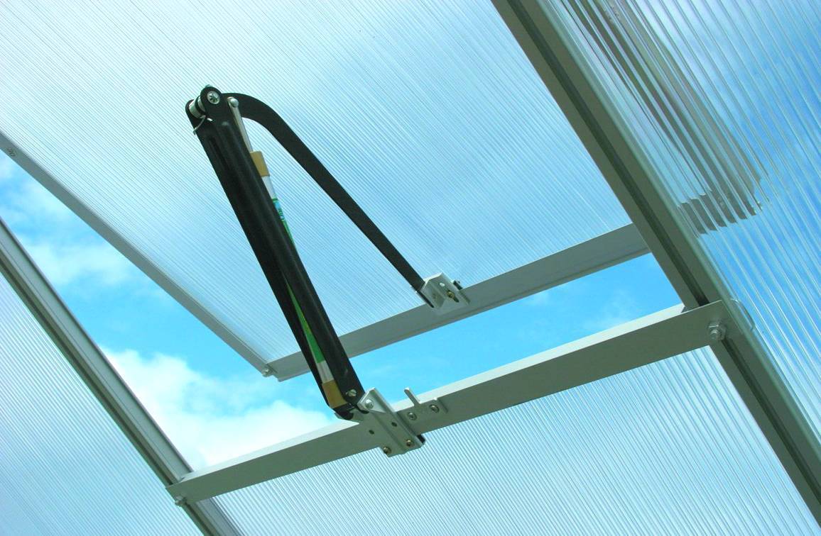 Термопривод для теплиц представлен в виде форточки, оснащённой автоматическими датчиками, которые срабатывают при чрезмерном поднятии температуры в середине теплицы. Вентиляцию устанавливают в потолочной части сооружения, из-за свойства нагретой воздушной массы подниматься вверх.