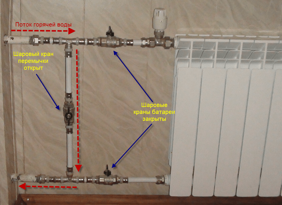 Это не единственная причина использования перемычки в отоплении. Нагрев помещения осуществляется с помощью радиаторов. При наличии байпаса с вентилями, хозяева квартиры имеют возможность самостоятельно провести регулировку подачи теплоносителя. Таким образом, контроль температурного режима в доме не составляет труда.