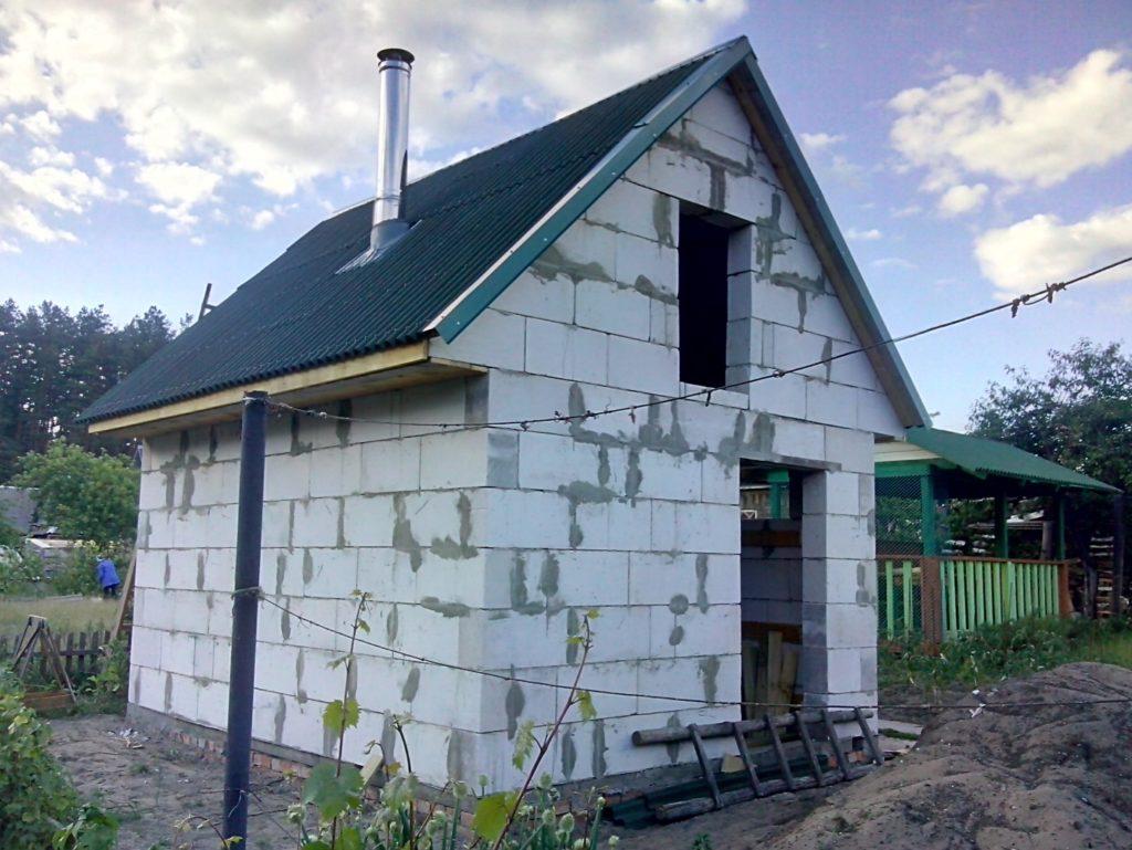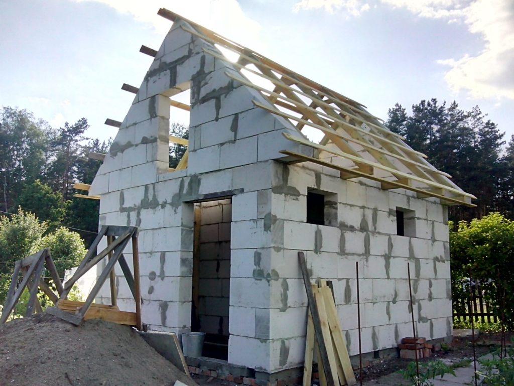 в соответствии с проектным планом сделать ленточный фундамент. После того, как он будет готов, сверху на него следует настелить два слоя рубероида. Это нужно для хорошей гидроизоляции. Затем, на слой раствора необходимо уложить армированную сетку, для придания дополнительной прочности конструкции; далее можно переходить к кладке первого ряда стен из блоков. И здесь просто не обойтись без строительного уровня. Потому что от точности самого первого ряда будет зависеть надежность всей остальной постройки. Также, в этом случае, становится практически минимальным риск появления трещин в стенах из-за несоответствия уровню; продолжать кладку остальных стен нужно, соблюдая такие же условия, как и для кирпича – делая смещение на половину длины блока. Единственное отличие от кирпичной кладки – в случае использования керамзитобетона следует через каждые 2 – 3 ряда устанавливать армированную сетку. Это необходимо для придания жесткости и дополнительной прочности постройке; дойдя до самого верхнего ряда стен, следует предусмотреть наличие ниш для балок – основы кровли. В случае двускатной крыши, которая будет оптимальным вариантом, необходимо установить стропила и обрешетку
