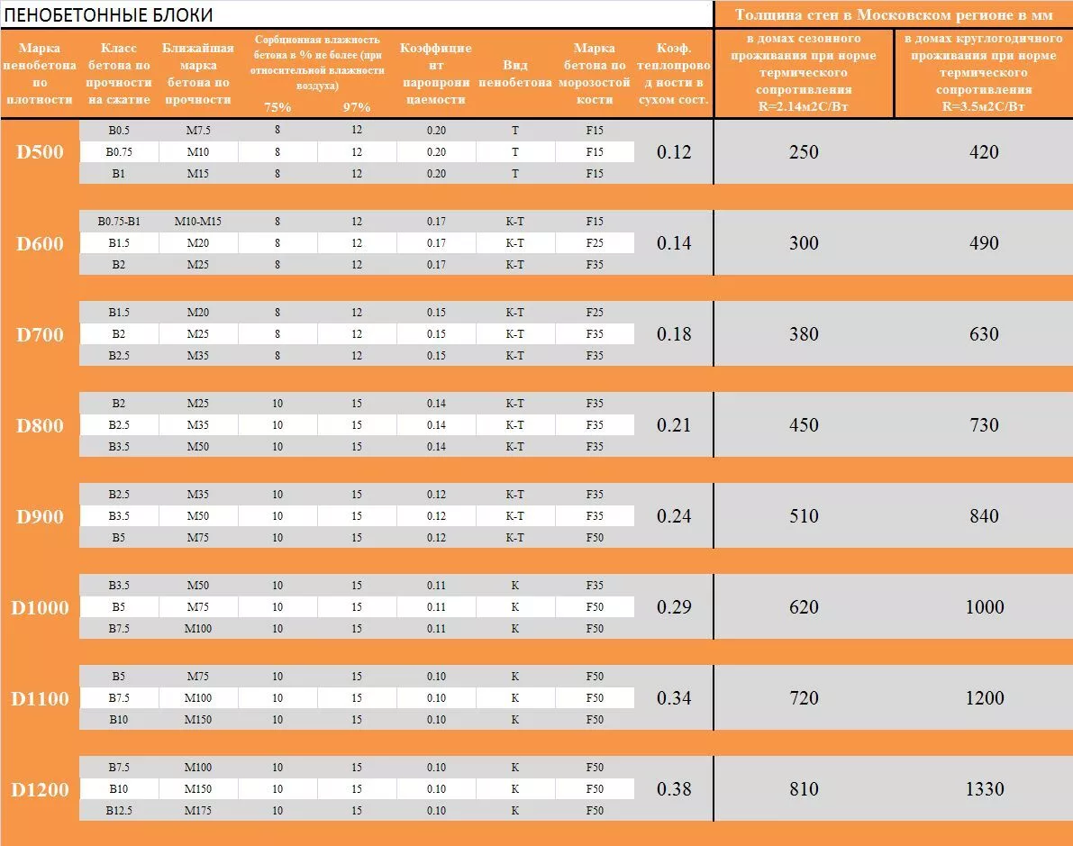 | Наименование | Коэффициент теплопроводности, Вт/(м*К) | Марка прочности | Плотность, кг/м3 | Показатель морозостойкости |