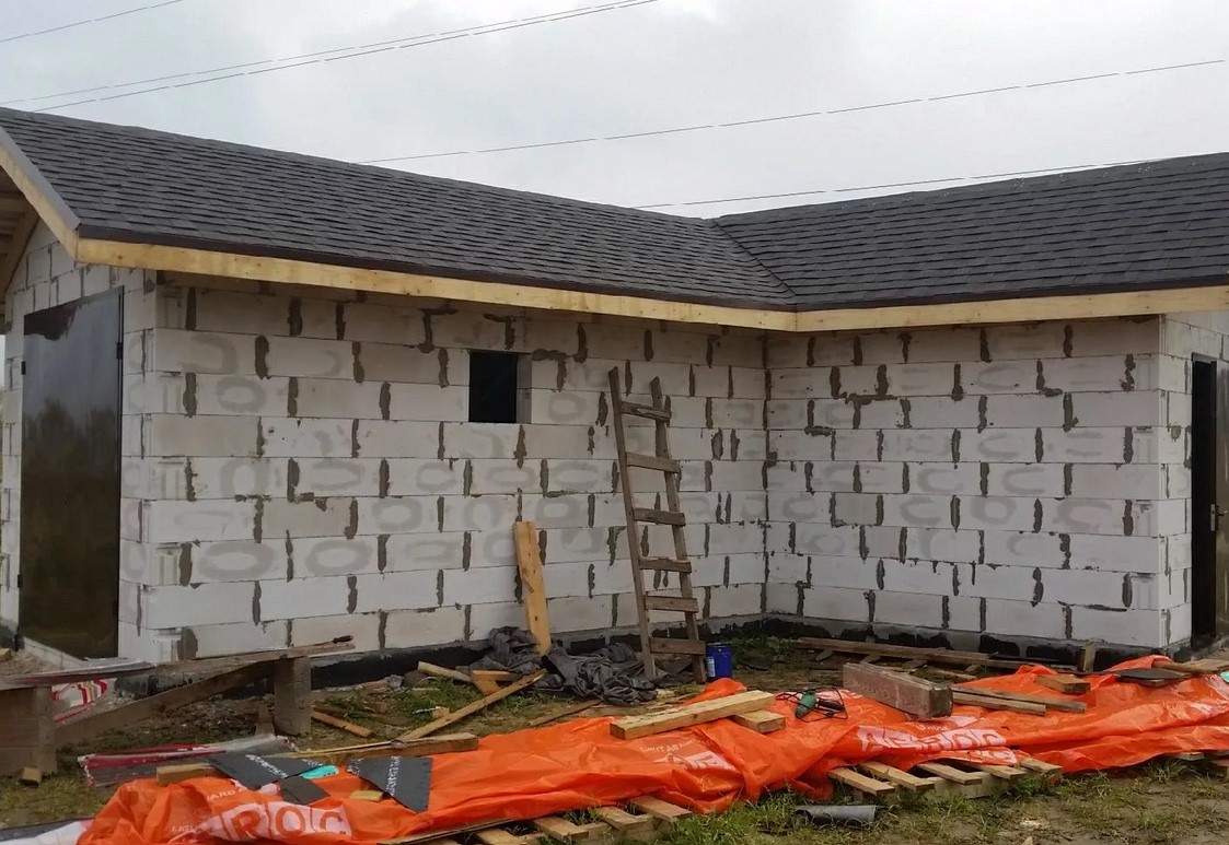 Перемычки над окнами и дверями установил из стального уголка. Затем приступил к изготовлению и установке балок перекрытия, стропильной системы и обрешетки.