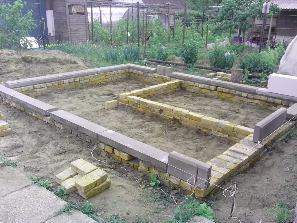 С углов начинается кладка стен. Ординаром вертикальности кладки послужит отвес. В первом ряду бечёвка, натянутая между угловыми элементами, послужит ориентиром для размещения линии блоков первого ряда. Независимо от количества, положенного под блоки вяжущего раствора, верхняя часть ряда блоков находится на одном уровне. Отклонения корректируются резиновой киянкой.