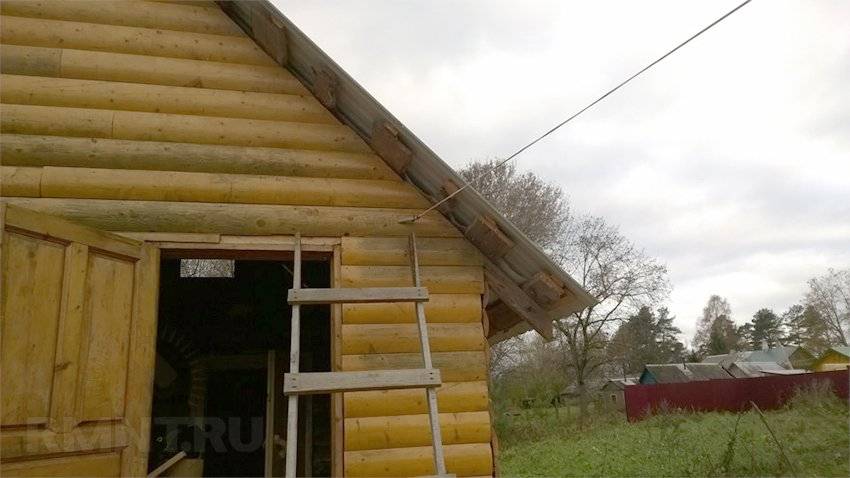 Седьмой шаг. Обустройте крышу. Надежный вариант – кровля на стропилах. Для создания стропил используйте брус сечением 5 см. Покрыть такую крышу можно профнастилом, металлочерепицей или другим подобным материалом. Финишное покрытие крепите к предварительно смонтированной дощатой обрешетке.