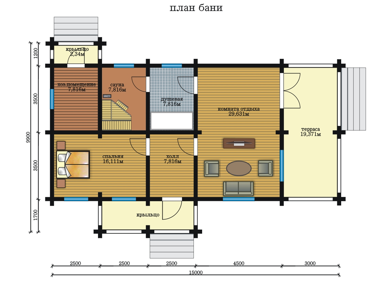 - 6х6. Помещение можно снабдить террасой. Вариант планировки: парная — 3х3 м, душевая с санузлом – 3х3 м, комната отдыха – 3х4,5 м, тамбур с террасой – 3х1,5 м.