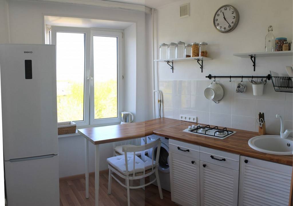 Третий вариант подойдет тем, кто собирается объединить кухню сбалконом. Не спешите ломать часть стены, которая раньше была основанием для внутреннего окна. Ее легко трансформировать в барную стойку. Основание у вас уже есть. Установите столешницу — и барная стойка готова.