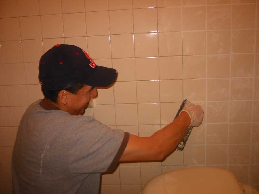 - Сначала подготовьте затирку, промыв и обезжирив ее. Затирка будет готова к нанесению реставратора, когда она высохнет.