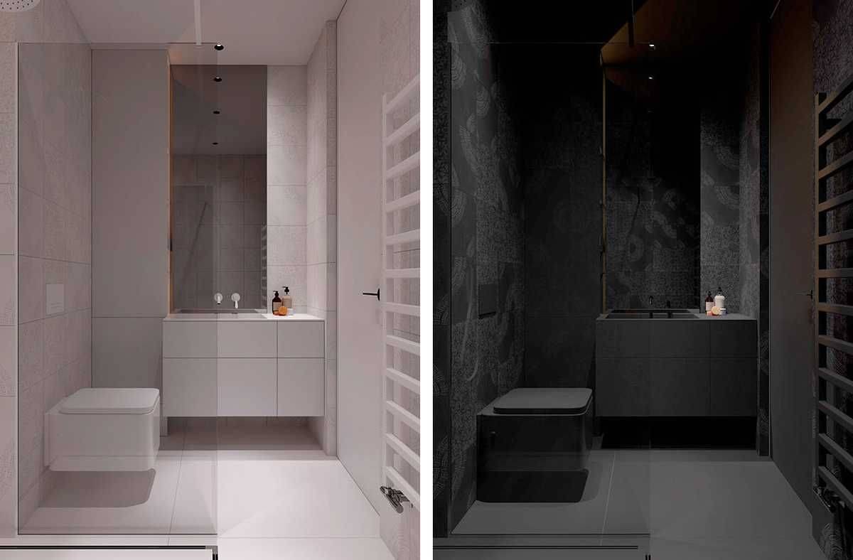 Санузел, в большинстве случаев, — это закрытая комната без доступа естественного света. Здесь используют только искусственное освещение, предусмотренное проектом. Когда в закрытой комнате нет света, вы воспринимаете ее, как абсолютно тёмную, даже если на стенах лежит белоснежная плитка. В то же время, если стены оформлены абсолютно чёрным материалом, но система освещения предельно интенсивная, то подобное восприятие исключается, и комната кажется уже не такой мрачной. Другими словами, от количества света напрямую зависит впечатление, которое производит интерьер.