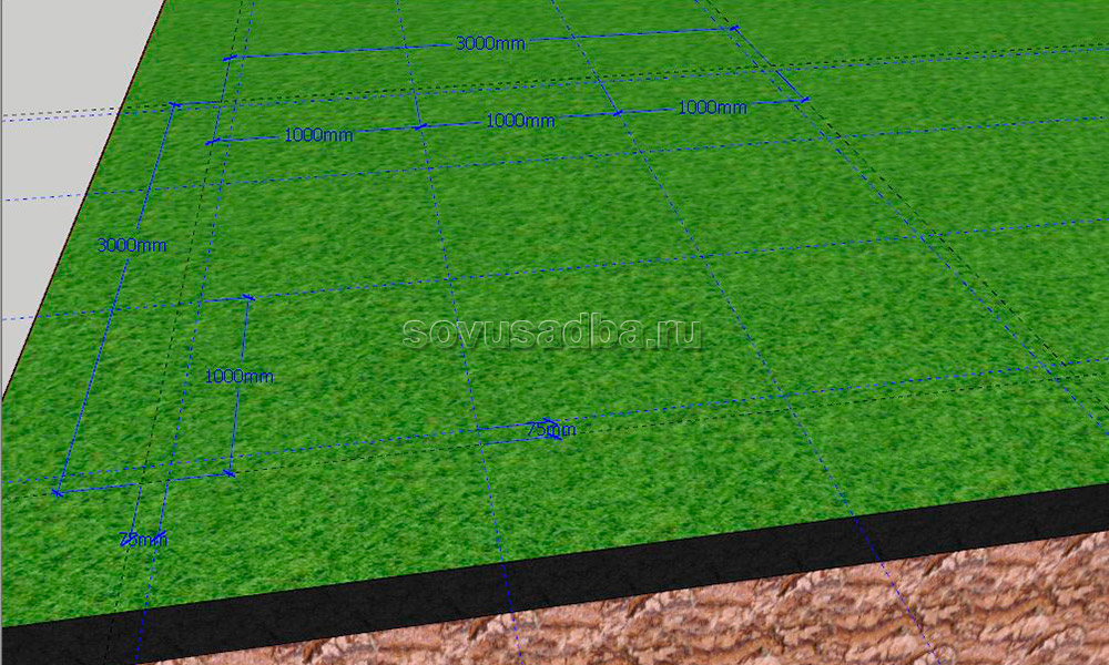 В нашем примере нужно “поставить на ноги” навес размером 3000х3000 мм, со стойками расположенными с шагом всего в метр, при этом мы помним что радиус канализационных труб, выбранных для постройки основания, 75 мм и они полностью должны прятаться в пятно застройки. В связи с этим разметка будет выглядеть следующим образом.