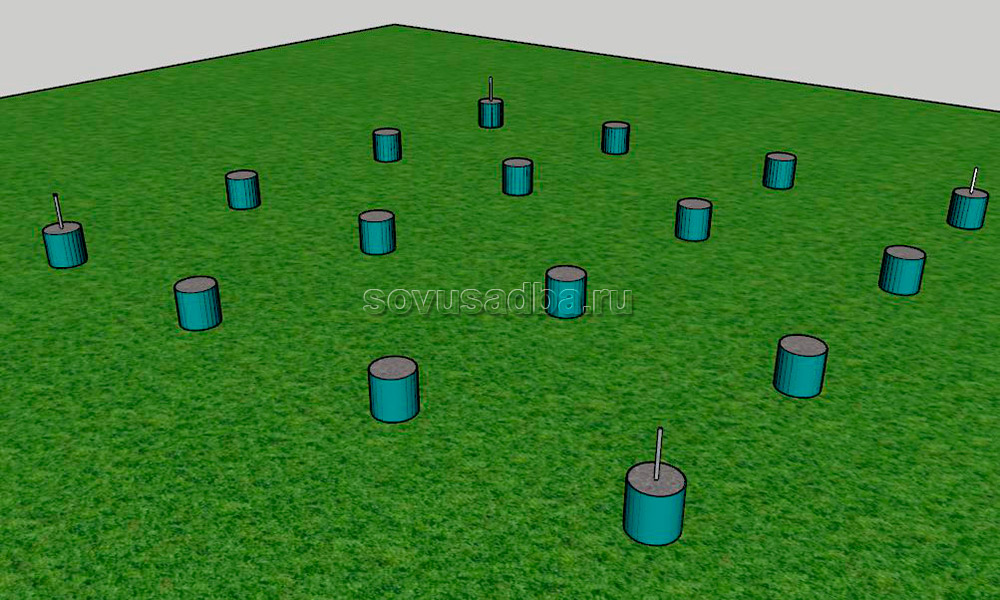 Бурить скважины нужно на пересечении линий. То есть, получится целых 16 штук. Для Подмосковья углубиться нужно на 1400 мм, для других регионов отметка будет другой и зависит от уровня промерзания почвы в регионе. Идея в том, чтобы только не допустить промерзание земли под подошвой сваи, ведь от касательных усилий пучения опоры защитит сам ПВХ тубус.