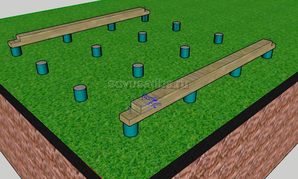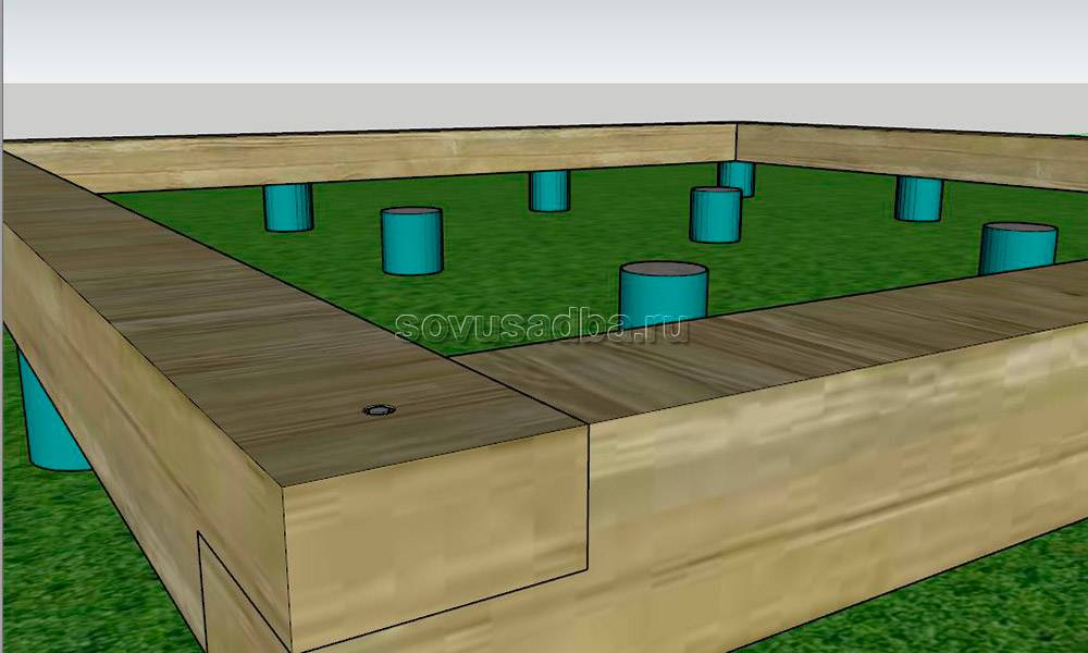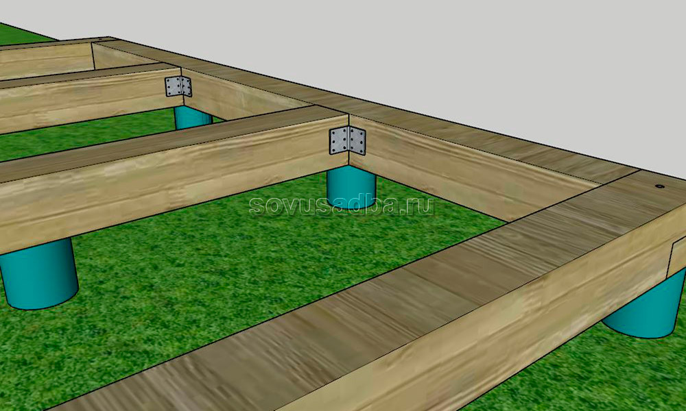 Но это еще не все. У нас осталось еще две пары не задействованных свай, как раз под две лаги. Если дерева хватает изготовить их можно из все того же бруса сечением 150х150 мм, если нет — возьмите доску сечением 150х50 мм. Установите дерево на опоры внутри периметра ростверка и прикрепите к последнему металлическими уголками. Не заморачиваясь, прибивать лаги к брусьям гвоздями, будет не лучшей идеей. Фундамент все таки.