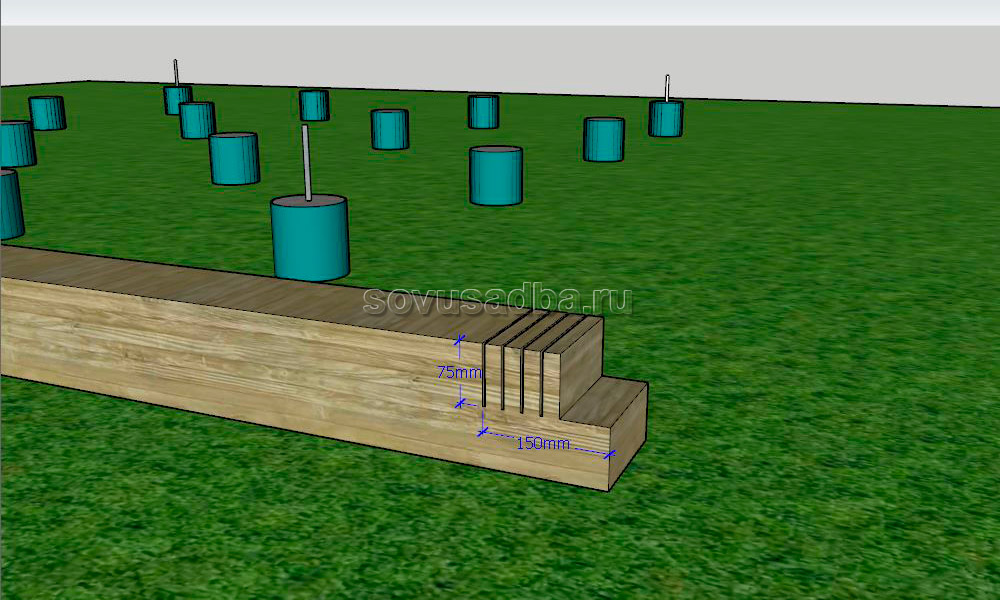 Поверх труб рекомендуется уложить слой гидроизоляции, чтобы предотвратить гниение нижней обвязки, и в дальнейшем — стен деревянной беседки из бруса. Для нижней обвязки на торце бруса делают Л-образный пропил, а также подготавливают отверстия под арматуру.