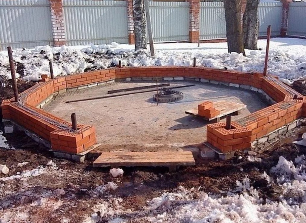 Итак, мы уже разобрались, что садовые постройки из кирпича достаточно тяжелы, поэтому требует заливки фундамента. Для открытых беседок вполне подойдет столбчатый фундамент, столбы следует располагать по углам и не более 2 м друг от друга. Изготовить их можно из кирпича, бутового камня, для небольших строений можно положить блоки из ячеистого бетона. Так же можно сделать арматурный каркас и залить его бетоном, подойдут и обычные трубы: асбестовые или металлические.