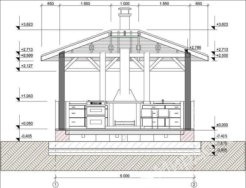 Если планируется установить печь или мангал из кирпича в беседке своими руками, возведение требуется продумать еще на этапе составления чертежа, потому как их присутствие сказывается на особенностях конструкции крыши. Так, понадобится организовать отверстия для дымохода, противопожарной муфты, а также для изоляции.