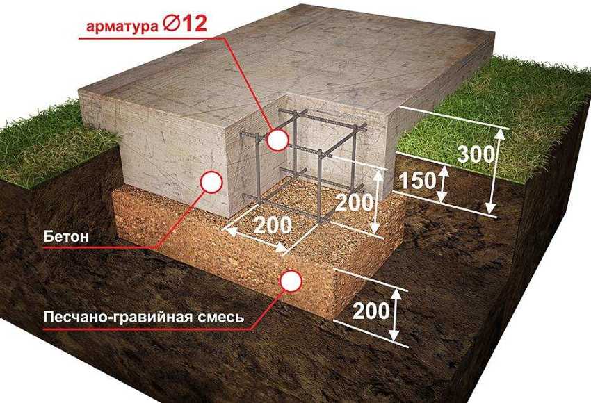 Первым делом снимается плодородный слой почвы глубиной до 300 мм. Дно обязательно армируется. Над уровнем грунта фундамент может возвышаться до 120 мм. По периметру устанавливается опалубка, после чего осуществляется процесс бетонирования.