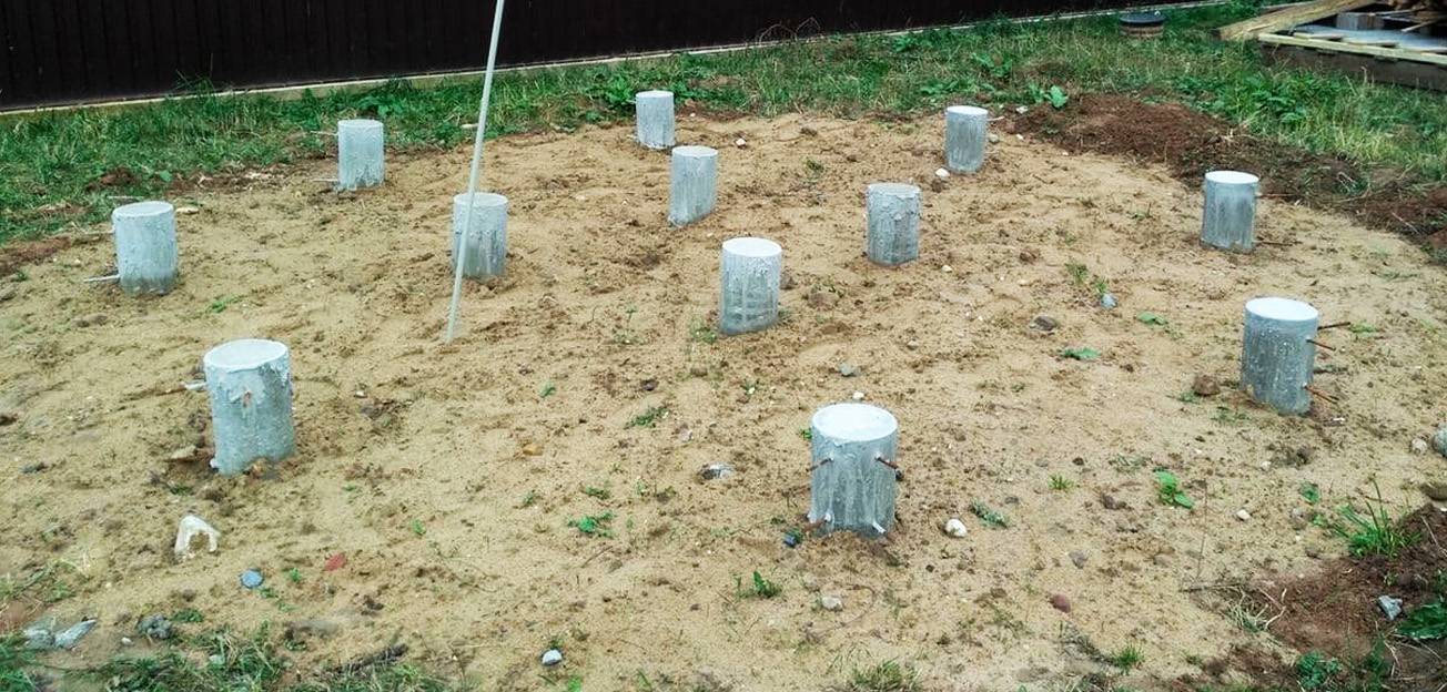 - Залить его в ямки, утрамбовать, вставить закладные. Фундамент нужно оставить на 4–5 дней, прикрыв сверху полиэтиленовой плёнкой. При это каждый день его придётся поливать водой.