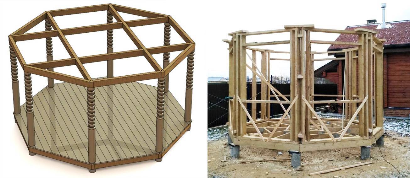Высота столбов рассчитывается от общего размера беседки. Чтобы конструкция была устойчивой, можно столбы расположить на более близком расстоянии. Обычно к опорам крепятся еще и пятки.