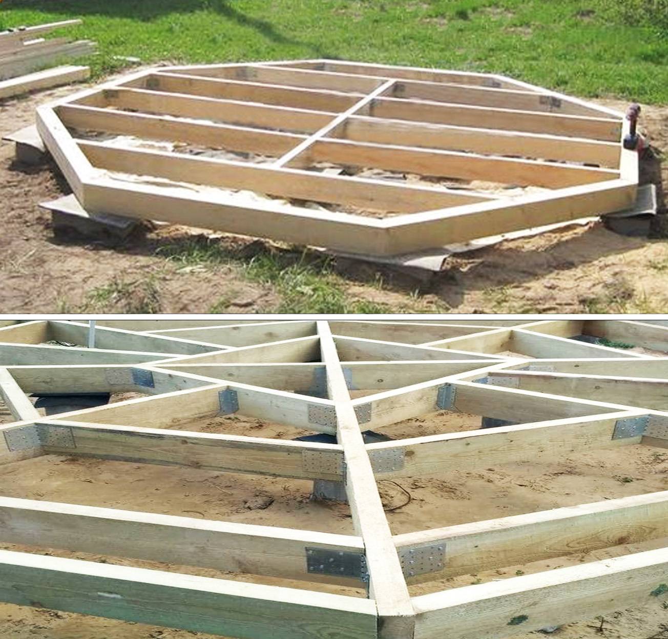 Нижняя обвязка беседки состоит из бруса 100-100 мм. Потребуется восемь штук, концы которых выпилены под углом, чтобы была возможность скрепить основание. Изнутри используют 8 уголков, выгнутых под углом в 135о.