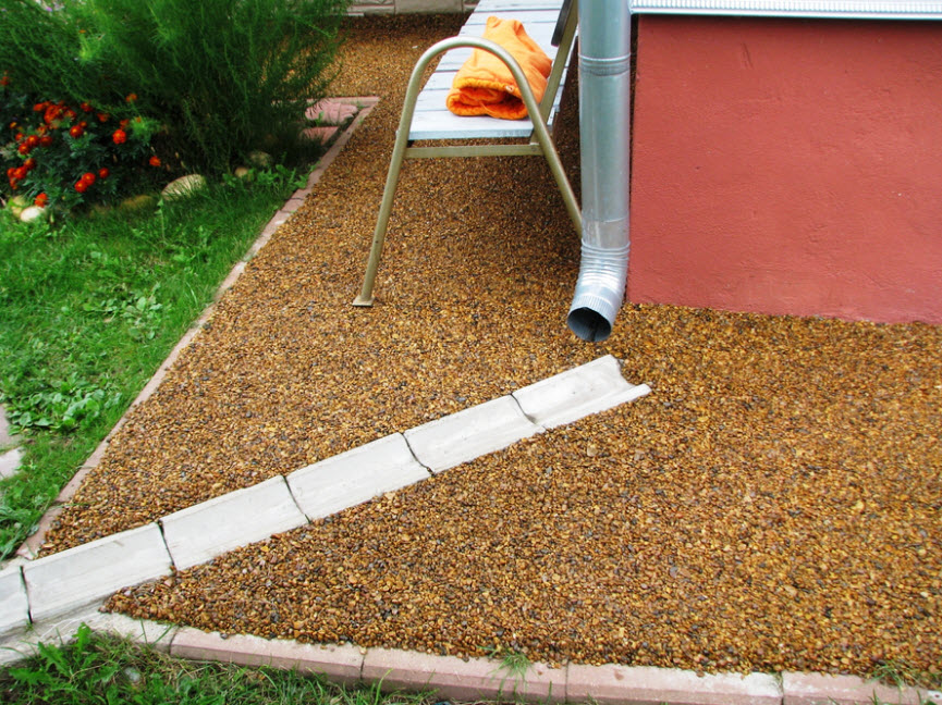 Считается одним из видов мягкой отмостки. Не подходит для глинистых, суглинистых почв без дренажа. Обойдется недорого.