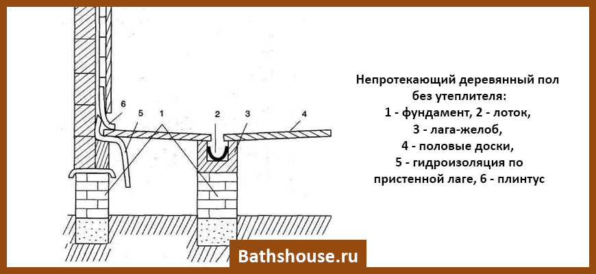 Чтобы сделать не протекающую конструкцию, необходимо углубить лаги в слой грунта, глины или бетона. Поверх таких лаг уже и стелятся деревянные полы, главным их достоинством является отсутствие сильного нагрева. Для непротекающей конструкции стяжку необходимо заливать к центру или с уклоном в одну сторону. Для стока воды необходимо установить сливное отверстие , которое должно быть закрыто решеткой. Из такого стока вода будет стекать в яму или канализационную сеть. Популярность такой конструкции достигается благодаря ее простоте, высокой надежности и долговечности. К недостаткам можно причислить то, что такой пол постоянно нуждается в хорошем просушивании , так как в противном случае он начнет гнить и дерево придется менять.