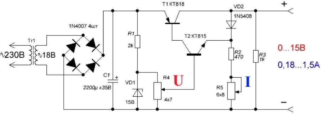 Самая распространенная схема блока питания с регулировкой напряжения и тока выполнена на двух транзисторах: силовом и усилителе. Она позволяет плавно регулировать напряжение в режиме холостого хода.