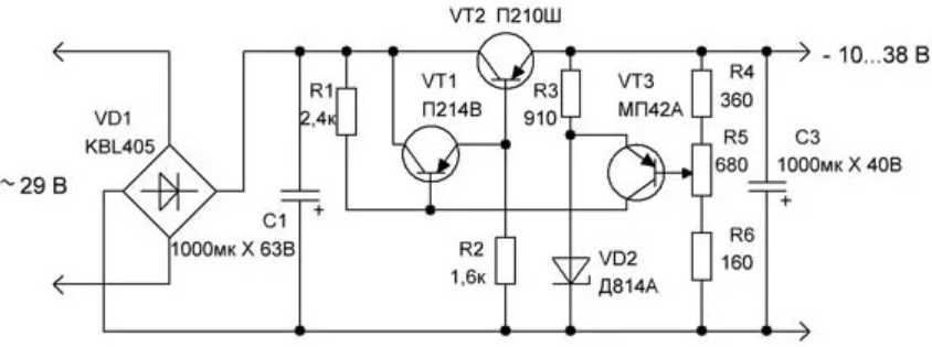 Схема с использованием транзистора п210 тоже довольно проста. Однако следует учесть, что данный транзистор подключается в отрицательное плечо. Также для согласованной работы всех компонентов цепи необходимо использовать понижающие трансформаторы. Они более совместимы по току и напряжению.