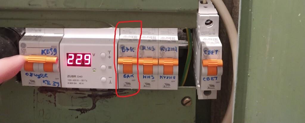Пример подключения нагревательного накопительного бака – автомат для него выделен красным, слева располагается УЗО. Чтобы электрооборудование не отключалось постоянно, на УЗО выставлен допустимый диапазон напряжения 215…230 В