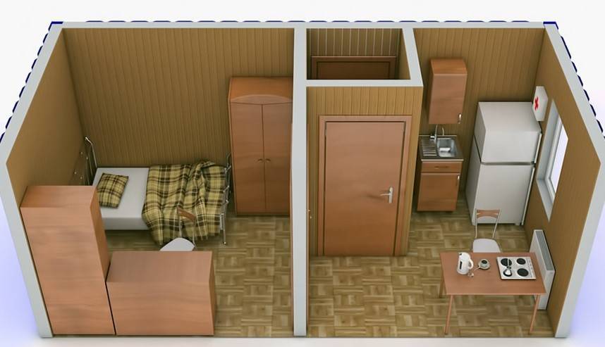 Самые жаркие дискуссии разворачиваются вокруг наилучшего распределения пространства бытовки. Планировка жилого блока ограничена общей площадью, а потому для минималистских боксов (3х2,3 метра) единственный возможный вариант планировки – это пространство без перегородок. Более широкие помещения подразделяются на вагончики с одной комнатой и служебными секциями (тамбур, санузел, хозблок) и такие же бытовки, но уже с верандой или крыльцом.