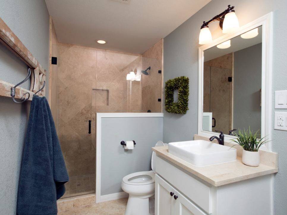 Окно в санузле часто располагают под потолком. Метод увеличивает освещение ванной или туалета, улучшает естественный воздухообмен. Парадную зону возле бытовки дополняют крытой верандой. Участок станет столовой или местом для семейных посиделок. Часть конструкции можно обустроить для хранения инвентаря.