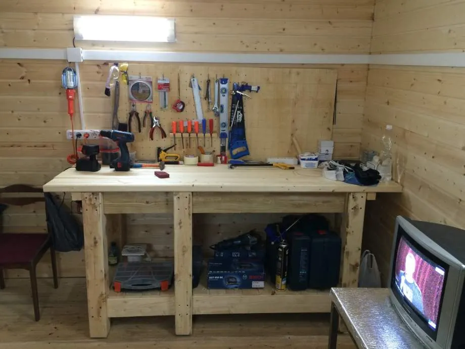 Деревянный верстак в гараже для мелкого ремонта