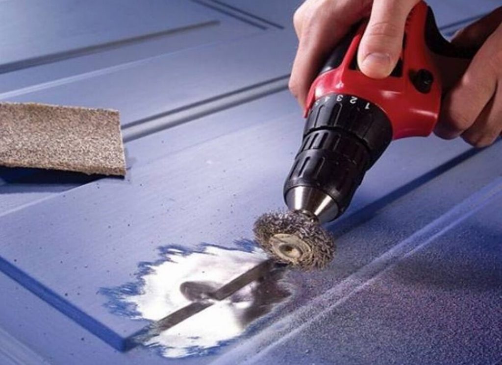 - На дрель фиксируется насадка с абразивом, и остатки краски снимаются методом шлифовки.
