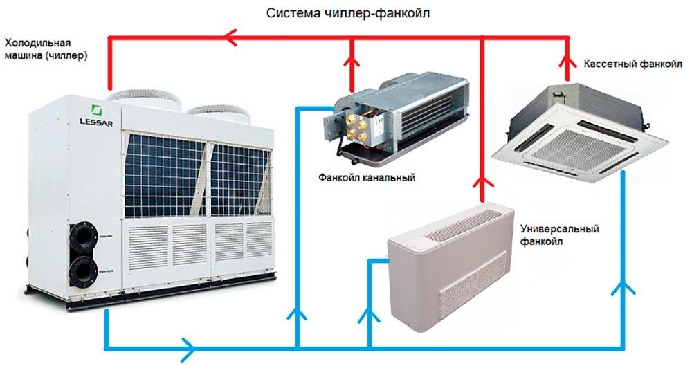 В данной технологии «чиллер» выступает в роли источника охлаждения или обогрева, а «фанкойлы» используются внутри помещений для кондиционирования или подогрева. В качестве теплоносителя (хладагента) применяется вода, которая циркулирует по трубам из пластика или металла (водяной контур).