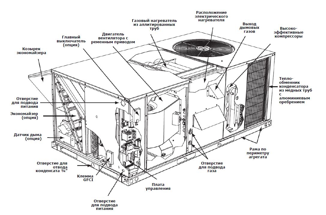 Крышные центральные кондиционеры, также известные как руфтопы, представляют собой кондиционирующие системы, размещаемые на верхней части здания. Руфтопы подходят для охлаждения и обогрева больших частных домов. Основной блок кондиционера устанавливается на крыше или вблизи здания.