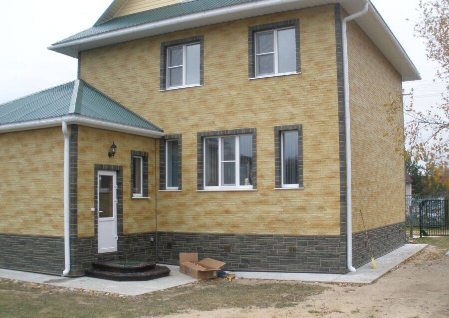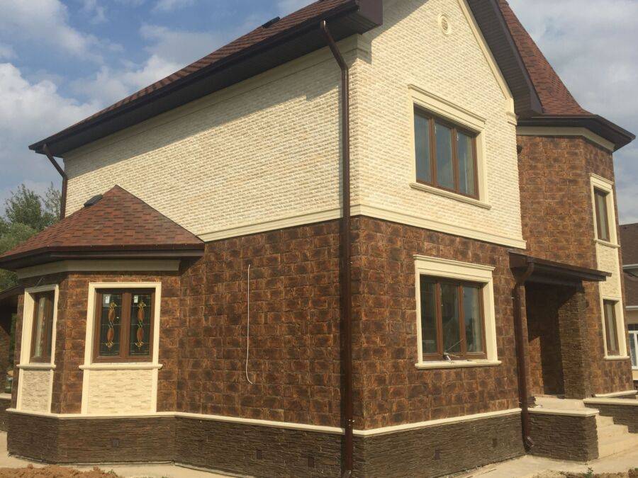 - Сайдинг фасадный. Является имитатором в пластиковом варианте кирпичной/каменной кладки. Весит не много, водостоек, стоит мало, просто монтируется, разнообразие дизайнерских разработок. Крепление каркасным способом позволяет создавать хорошее вентилирование нижнего этажа. К минусам относят термическую расширяемость, низкую устойчивость к УФ-лучам;