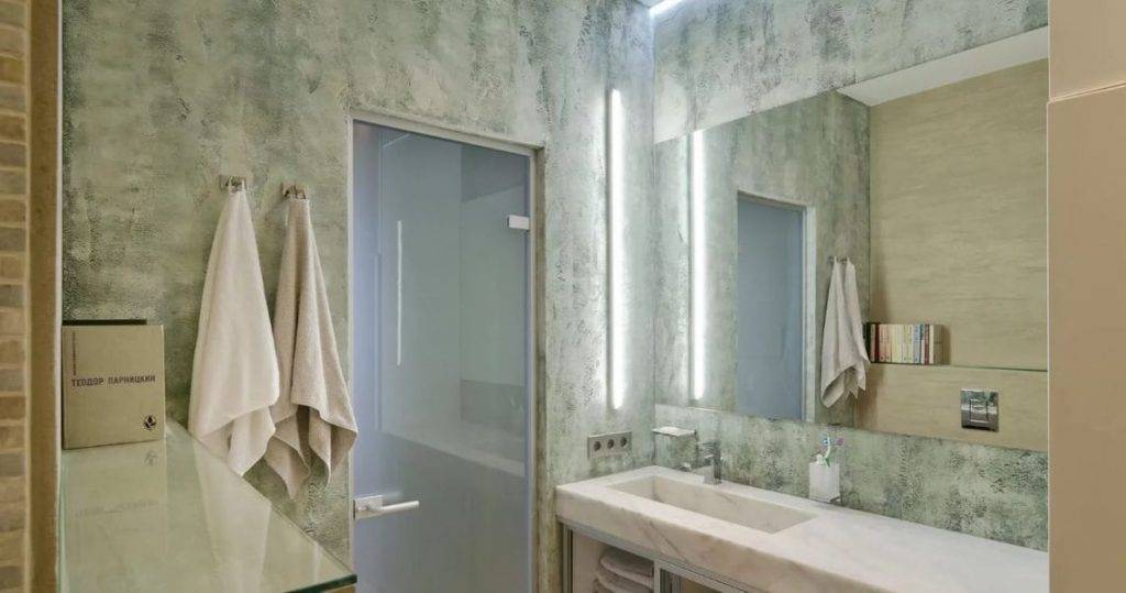 Для отделки ванной идеально подходит венецианская штукатурка, которая станет настоящим украшением комнаты. Такой материал имитирует натуральный камень, а именно, мрамор. После застывания поверхность становится глянцевой, стены не поглощают влагу, вода просто по ним скатывается.