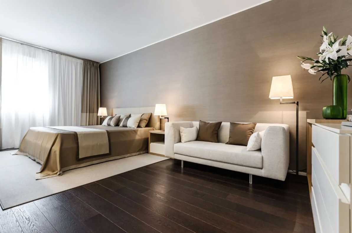 Гостиные, спальни и столовые, оформленные в разных цветах единой оттеночной палитры, кажутся спокойными и гармоничными. Такое сочетание оценят по достоинству любители размеренного жизненного уклада, здесь проявляются все положительные аспекты классики, особенно если выдержать напольную отделку в гамме горького шоколада, идеально подчеркивающего оттенок какао на стенах и нежность кремовой палитры потолка.