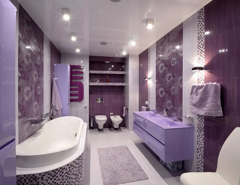 Цвета керамической плитки для ванной отлично сочетается с желтым и золотистым. Дизайнеры вводят серые тона в сочетание с фиолетовым, что придает эксклюзивность интерьеру. Цвет состоит из красного и синего. плитка двух цветов в ванной оказывает влияние на психику может быть как успокаивающим, так и возбуждающим.