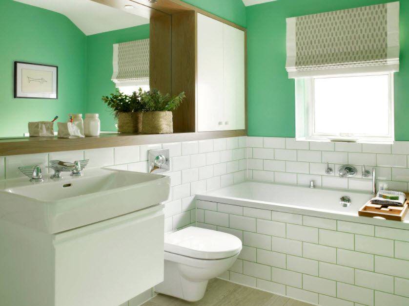 Зеленые тона хорошо раскрываются в ванной комнате. Цвет плитки в ванной морской волны умиротворяет. Салатовый насыщает помещение энергией, бодрит. Является цветом радости. Хвойные оттенки рекомендуется сочетать с серым, получается «сибирская» гамма. Зеленые цвета выгодно контрастируют с красными, насыщая интерьер динамикой.