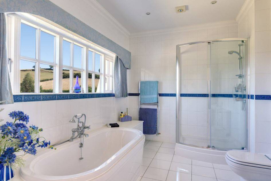 Стиль кантри лучше смотрится в больших ванных. Синеватые оттенки выбирайте природные, благородные. Яркий цвет разбавляйте натуральными материалами и декором, созданным вручную.