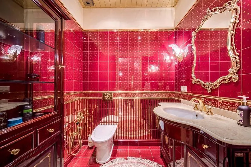 Чем больше красного в комнате, тем ярче делают свет. Правильное освещение включает основной и дополнительный источник, хорошо, если интенсивность светового потока можно регулировать. Лампы и бра помогают выделить зону зеркала, ванну, подсветить полки и шкафчики.